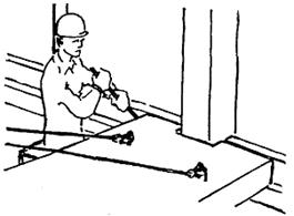 УКЛАДКА ПАНЕЛИ; 2,5 мин; М1, М2, М3; ломы, строп Монтажник М1, стоя на верхней площадке РШИ, подает команду машинисту крана опустить связную панель над консолями колонн. Монтажник М2, находясь на одной из промежуточных площадок РШИ, а монтажник М3 - в нижней люльке РШИ, наводят наклоненную часть панели на опору со стороны хомута, расположенного в пролете РШИ. По команде монтажника М1 машинист крана медленно опускает панель на опоры, а монтажник М2, придерживает ее сбоку. При необходимости он ломом рихтует опорную часть панели так, чтобы закладные детали ее и ригеля совпали. Другой конец панели укладывают на опоры аналогично |