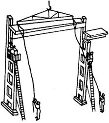 1 - кран; 2 - оттяжка; 3 - приставные лестницы с площадками; 4 - подкрановая балка; 5 - траверса; 6 - страховочный канат; 7 - колонна