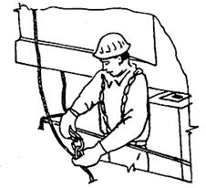 Струбцина 1 - скоба; 2 - страховочный канат; 3 - коуш; 4 - колонна Монтажники М1 и М2 поднимаются на монтажные площадки лестниц, установленных у соседних колонн, захватив с собой стальные подкладки и электросварочный инструмент. Затем с помощью пенькового каната они поднимают наверх страховочный. Один из монтажников поднимается на консоль колонны по лестнице длиной 2 м, установленной и закрепленной на площадке приставной лестницы, и, закрепившись предохранительным поясом за колонну, крепит струбциной страховочный канат на высоте 2 - 2,2 м от верха консоли |