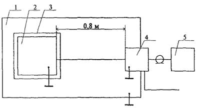 1 - металлический лист; 2 - испытуемое оборудование; 3 - подставка из изоляционного материала; 4 - эквивалент сети; 5 - измеритель радиопомех