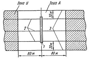 1) на расстоянии до 80 м от оси промежуточной опоры по обеим ее сторонам вдоль смежных пролетов в течение не более 180 мин (зона А, рис. 1);