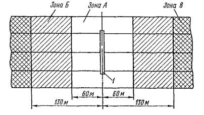 1) на расстоянии до 60 м от оси промежуточной опоры по обеим ее сторонам вдоль смежных пролетов в течение не более 180 мин (зона А, рис. 2);