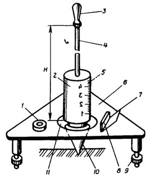 Прибор состоит из опорной рамы 1 со съемной задней опорой и со стойкой 16, по которой перемещается ось маятника, состоящего, из стержня 8, корпуса 11, башмака 12 с резиновой накладкой 13. Башмак соединен с рукояткой 10, имеющей регулировочный винт 9. Удерживание маятника в исходном положении и его сбрасывание осуществляется с помощью запорного механизма 7. Отсчет показаний прибора ведется по шкале 3 стрелкой 4. Легкость вращения стрелки вокруг оси регулируется кольцами 5. Защелка 15 удерживает маятник от раскачивания при переносе прибора.