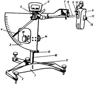 1 - опорная рама; 2 - опорный винт; 3 - шкала; 4 - стрелка; 5 - регулировочные кольца; 6 - калиброванный стержень; 7 - запорный механизм; 8 - стержень маятника; 9 - регулировочный винт; 10 - рукоятка; 11 - корпус маятника; 12 - башмак; 13 - резиновая накладка башмака; 14 - реечный механизм с рукояткой и зажимным винтом; 15 - удерживающая защелка; 16 - стойка; 17 - уровень