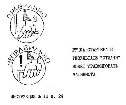 24. При пуске двигателя с помощью пусковой рукоятки запрещается брать ее в обхват; все пальцы руки должны быть с одной стороны рукоятки, чтобы избежать ушиба или перелома руки вследствие обратного удара рукоятки при раннем зажигании. Запрещается вращать рукоятку вкруговую.