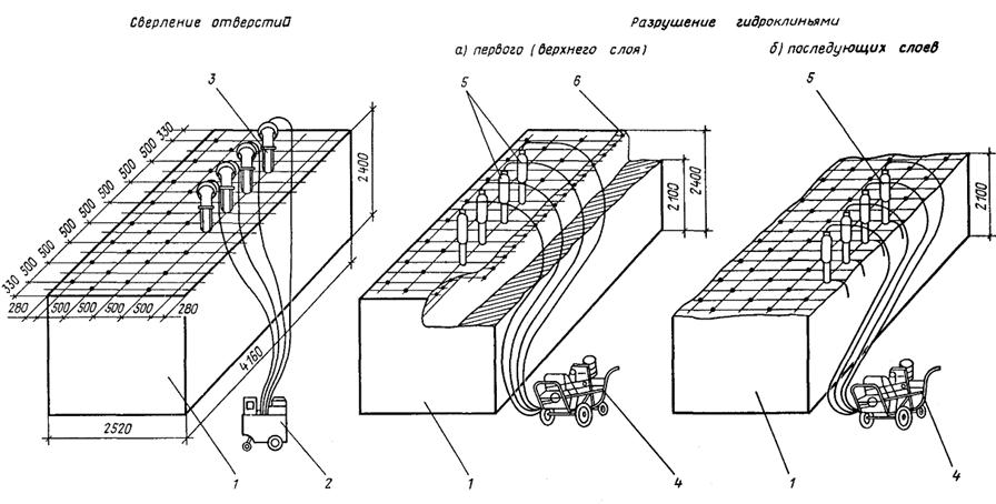 Разрушение монолитной железобетонной конструкции гидроклиновой установкой производится за счет расклинивающих усилий, создаваемых в высверленных отверстиях.