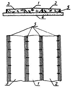 1 - маячный (первый) ряд; 2, 3 - примыкающие ряды; 4 - основание дорожной одежды; 5 - объемный арматурный каркас