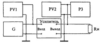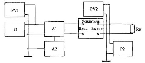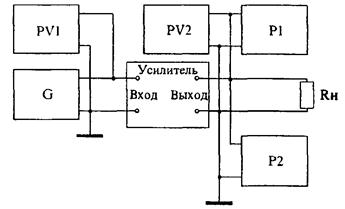 G - генератор сигналов низкочастотный, PV1, PV2 - вольтметр, P3 - контрольное приемное устройство, Rн - резистор нагрузки