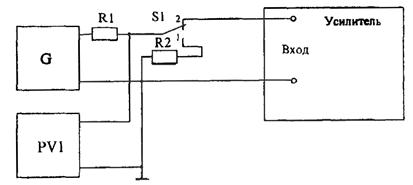 G - генератор сигналов низкочастотный, PV1 - вольтметр, R1 - резистор (10 ± 0,5) кОм, R2 - резистор (620 ± 6,2) Ом, S1 - тумблер