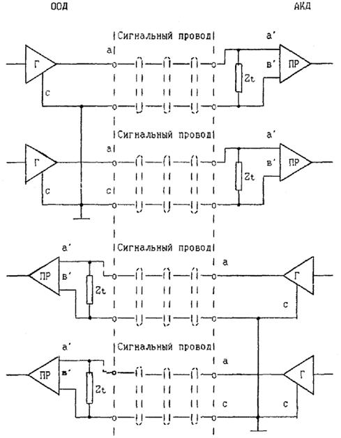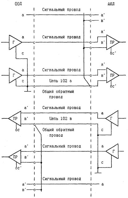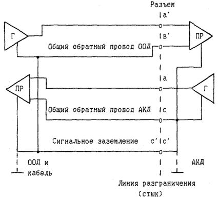 4.1.2 Типичными случаями применения несимметричных цепей стыка является соединение оконечного оборудования данных (ООД) с аппаратурой окончания канала данных (АКД) или двух ООД.