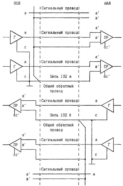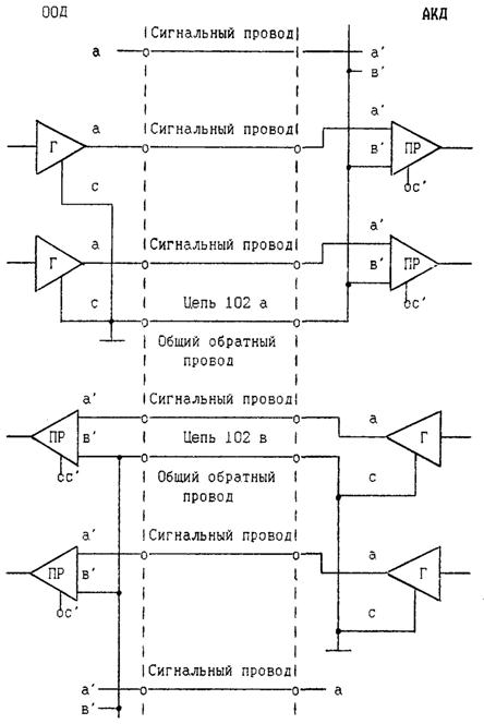 Примечание - Например, точки в всех приемников в ООД, которые соединяются с несимметричными генераторами в АКД, должны подключаться к цепи «Общий обратный провод» 102в, которая соединена с землей только в АKД. Цепь «Общий обратный провод» 102а, к которой подключаются точки в¢ всех приемников в АKД, должна соединяться с землей только в ООД в точке с, как показано на рисунке 15 и рисунке 16.