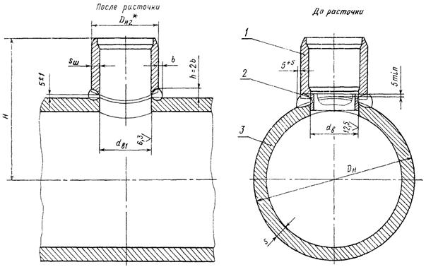 6. После сварки штуцер (поз. 1 на черт. 1, 2) растачивается напроход до диаметра dв1 с целью удаления подкладного кольца и корня шва.