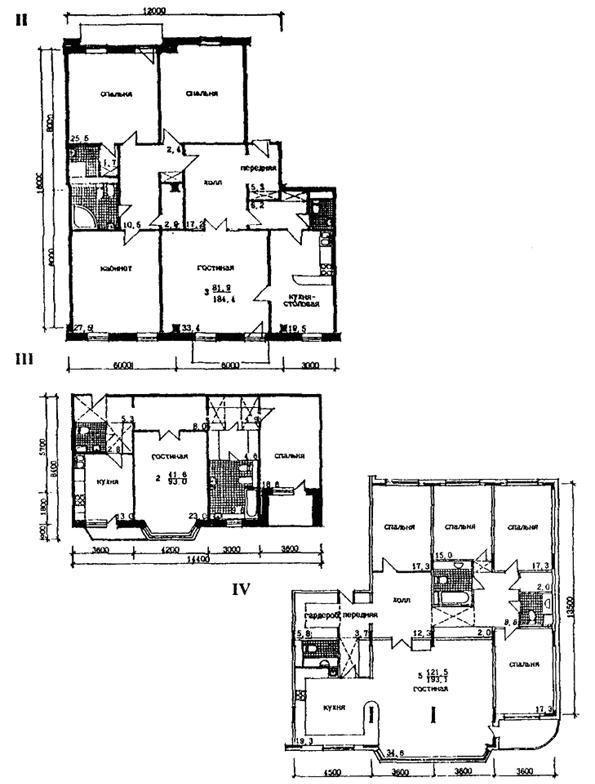 III - трехэтажный жилой дом с кирпичными стенами (коттедж «Барс»): д - план цокольного этажа, е - план 1 этажа, ж - план 2 этажа, и - план 3 этажа - мансарды (МНИИТЭП, М1. Архитекторы: А. Надысев, Т. Принтц и Н. Скуридина).