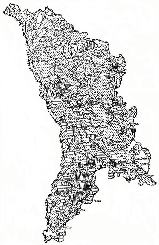 Рис. 3. Карта распространения на территории Молдавской ССР оползней (количество оползней на 1 км2):
