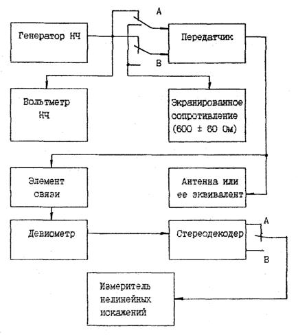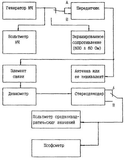 При снятии сигнала со входа НЧ одного канала передатчика и подключении к нему экранированного сопротивления 600 Ом измеряют в этом канале на выходе стереодекодера помеху (Uп) из другого канала.