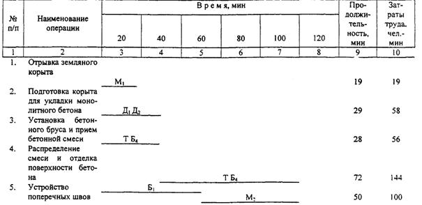 Б1 нарезает вибропластиной поперечные швы через 2,5 - 3 м (в местах швов бетонного покрытия и дополнительно по середине плиты), пользуясь приемом устройства швов в свежеуложенном бетоне. М2 оказывает помощь б1 в нарезке пазов швов вибропластиной и заделке в шве гидроизоловой ленты. |