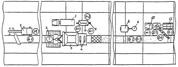 1 - автогрейдер; 2 - трактор; 3 - бункерный распределитель; 4 - вибраторы; 5 - автосамосвал; 6 - передвижная электростанция; 7 - емкость для битумной эмульсии; 8 - компрессор; 9 - емкость с битумной мастикой; 10 - автокран; 11 - прицепная тележка