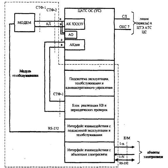 4.3.4 Комплекс оборудования для технического обслуживания периферийных цифровых АТС ОС (УС) состоит из МОДЕМа и модуля технического обслуживания, входящего в спецификацию ЦАТС. Функции, выполняемые модулем технического обслуживания, а также внешние стыки подключения к контрольным точкам аналогичны функциям и стыкам оборудования ЦТЭ (рисунок 3).