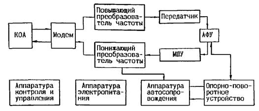 4.6 Функциональными элементами ЗС являются: антенная система с аппаратурой автосопровождения спутника или без нее. МШУ, усилитель мощности передатчика, понижающий и повышающий преобразователи частоты, модем и аппаратура многостанционного доступа, каналообразующая аппаратура (мультиплексор), система контроля и управления, аппаратура защиты информации, а также ряд вспомогательных систем (электропитания, обогрева и пр.).