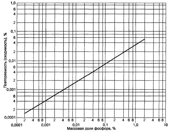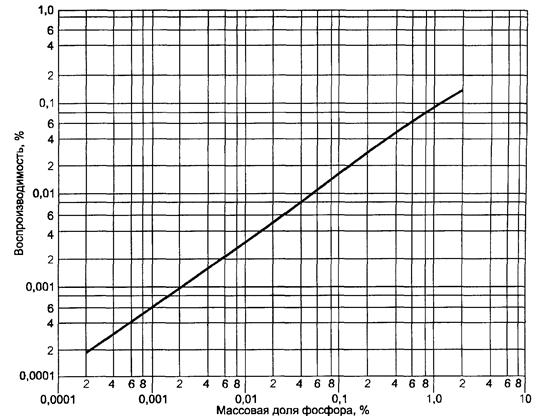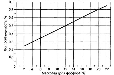 Если необходимо, повторно проводят регулировку гальванометра на коэффициент пропускания, равный 100,0 %, и получают не менее трех показаний на образцах. Расхождения не должны превышать 0,2 %. Для определения массовой доли фосфора по калибровочному графику используют среднеарифметическое значение этих показаний.
