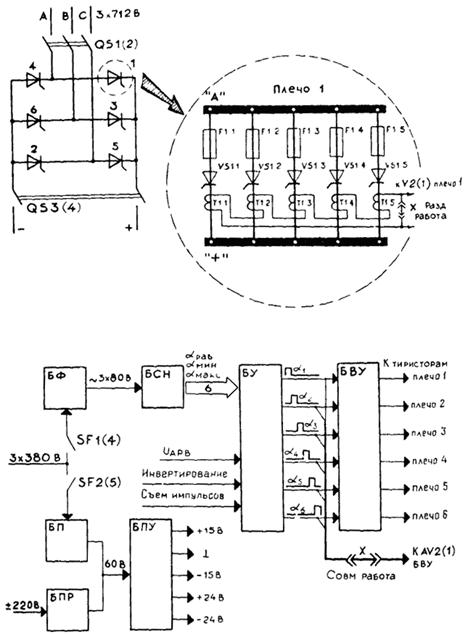 Унифицированы также блоки питания и блок контроля БК, хотя нагрузка источников питания и алгоритм контроля исправности преобразователей больше всего зависят от количества тиристоров в вентильном плече, которое различно для разных типов систем.