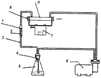 1 - пористая пластинка; 2 - ловушка с ватой; 3 - шланги соединительные; 4 - дрексель; 5 - реакционный сосуд; 6 - микрокомпрессор; 7 - блок для установки кюветы; 8 - кварцевая ячейка; 9 - поток резонансного излучения (ртутная лампа).