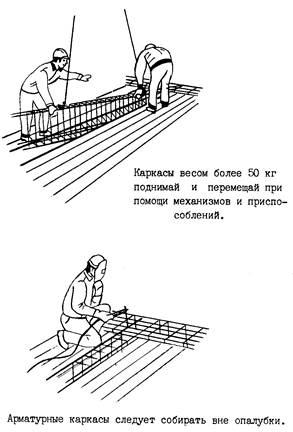 42. Арматурные каркасы и сетки весом более 50 кг следует поднимать и перемещать при помощи механизмов и приспособлений.