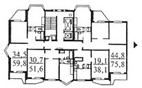 - с размещением лестничной клетки (или лестнично-лифтового узла) в центральной части секции с ориентацией на внутреннюю (или внешнюю) сторону секции;