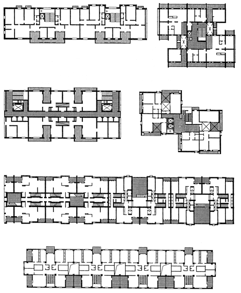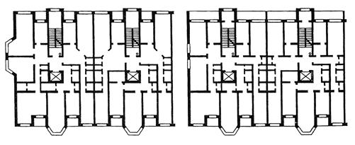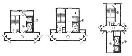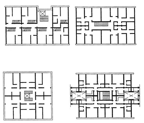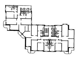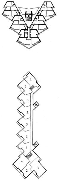 Форма плана коридорных жилых зданий: протяженная - с коридорами, соединяющими лестнично-лифтовые узлы (или лестничные клетки), или компактная - с коридором, имеющим, как правило, круговой обход вокруг лифтового узла.