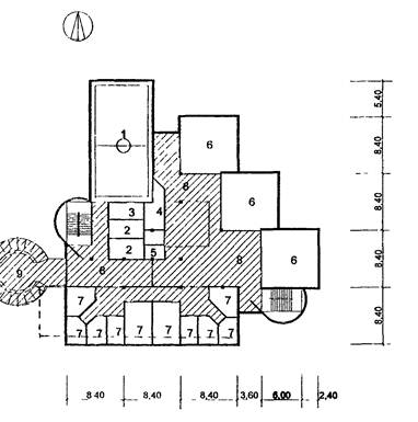 7 - рекреация зального типа; 8 - санузел