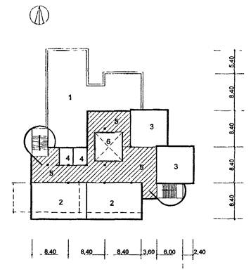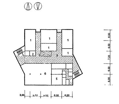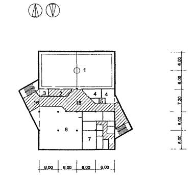 6 - обеденный зал столовой; 7 - помещения кухни.