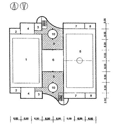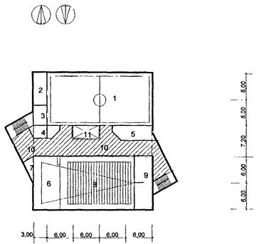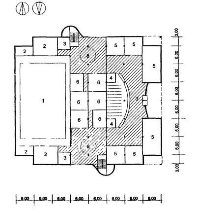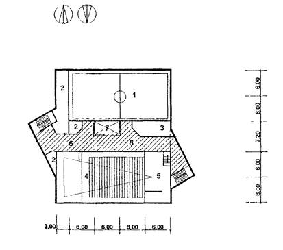 4 - санузлы, 5 - душевая с раздевальной; 6 - эстрада; 7 - кладовая; 8 - актовый