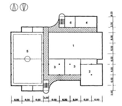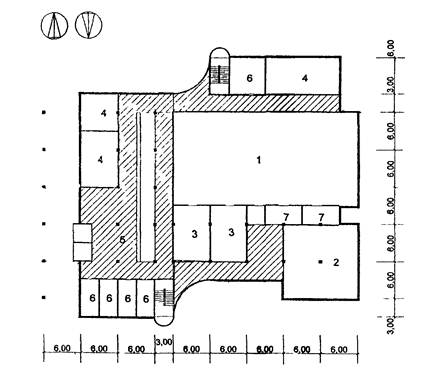 4 - административные помещения; 5 - медблок; 6 - вестибюль с гардеробом;