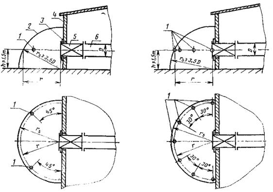 Измерение шумовых характеристик вентилятора с электрическим приводом производят в двух точках, расположенных под углом 45° к оси вентилятора; с пневматическим приводом - в семи точках, расположенных через 30°, как показано на черт. 8.