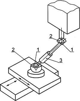 Телескопическая оправка со сферическими шарнирными опорами 1 (рисунок 4) закрепляется в соответствующих держателях 2 на станке с ЧПУ, один держатель - на столе станка, другой - на шпиндельной бабке, которая перемещается по круговой траектории относительно стола.