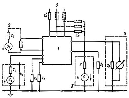 К испытуемым входным клеммам присоединяют генератор G1 входного сигнала. К тем же клеммам через соответствующие вспомогательные устройства, например отделительные импедансы Z0 подключают генератор стандартных сигналов помех G. Если испытуемое изделие имеет несколько входных клемм, то остальные клеммы подсоединяют через импедансы Zs, к нейтральной клемме изделия.