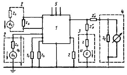 1 - испытуемое изделие; 2 - генератор входного сигнала; 3 - генератор стандартных помех; 4 - испытательное устройство на выходе изделия; 5 - источник питания