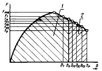 1 - деформирующая энергия Ea; 2 - добавочная энергия при испытании перегрузкой; D - деформация (прогиб) кабины, mm; Da - общая деформация кабины в ходе горизонтальной нагрузки (без перегрузки), mm; D1 - деформация, соответствующая величине 0,95Da, mm; Dр - общая деформация кабины в ходе испытания перегрузкой, соответствующая Еар, mm; Dp1, 2, 3 - деформация, соответствующая Еар1, 2, 3, mm; F - статическая нагрузочная сила, N; Fmax - максимальная нагрузочная сила в ходе горизонтальной нагрузки (без перегрузки), N; Fа - нагрузочная сила, соответствующая Еа, N; Fp - нагрузочная сила, соответствующая D1, N; Fp - нагрузочная сила, соответствующая Еap, N; Fp1, 2, 3 - нагрузочные силы, соответствующие Еap1; 2; 3, N