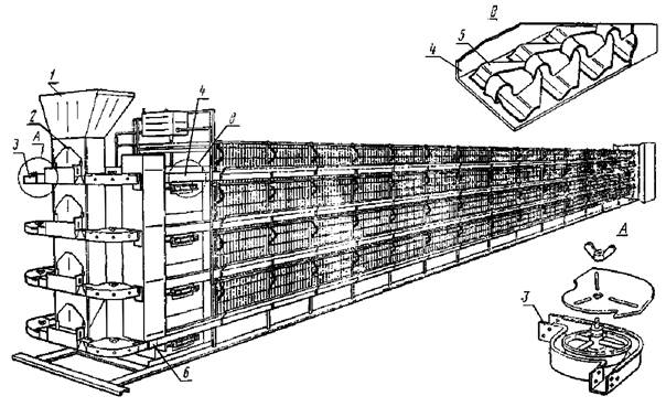 1 - птичник; 2 - внешний бункер для корма; 3 - корморазгрузчик; 4 - система кормораздачи; 5 - клеточные ряды