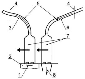 в) ту же газовоздушную смесь закачивают в нижнюю емкость 2 до тех пор, пока воздушный шарик не продвинется вверх по трубке 5 настолько далеко, насколько это возможно;