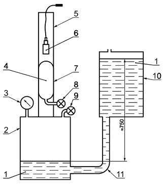 ж) воздушный шарик протыкают иглой через отверстие 7 в трубке 5. Это приводит к мгновенному выпуску газовоздушной смеси из шарика 4 и из нижней емкости 2, которая находится под давлением приблизительно 7 кПа. Газовоздушная смесь заполняет всю трубку и, так как вода возвращается в нижнюю емкость (что занимает около 20 с), в трубку непрерывным потоком поступает свежая смесь. Продолжительность течения смеси при необходимости может быть увеличена до 30 с (максимальное время испытания) при размещении сужающего устройства в шланге 11, соединяющем две емкости. Регистрирующее устройство, подключенное к выходу измерительного блока прибора, должно иметь разрешающую способность 1 с, что может быть использовано для определения времени, за которое показания прибора достигают значений, составляющих 50 % и 90 % НКПР. Как альтернатива, воздушный шарик в трубке диаметром 75 мм может быть заменен на шаровой клапан диаметром 75 мм. Это значительно упрощает процедуру, и те же результаты, которые дает лопнувший воздушный шарик, получают за счет быстрого открытия клапана.