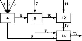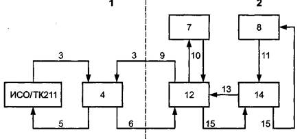 1 - международные организации; 2 - национальные организации; 3 - представитель организации; 4 - контролирующий орган; 5 - обратная связь; 6 - направление; 7 - орган аккредитации; 8 - орган сертификации; 9 - приложение; 10 - признание соответствия нормам; 11 - сертификат; 12 - испытательная лаборатория; 13 - заказ; 14 - клиент; 15 - отчет о тестировании