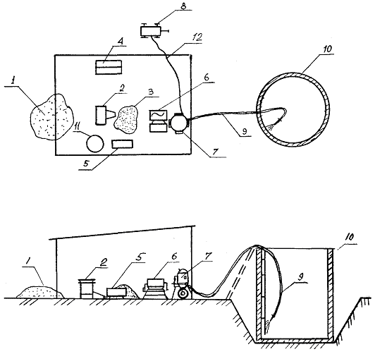 1 - песок; 2 - вибросито; 3 - просеянный песок; 4 - ларь для цемента; 5 - емкость для воды; 6 - растворомешалка; 7 - пневмобачек; 8 - компрессор; 9 - материальный шланг; 10 - резервуар; 11 - емкость для латекса; 12 - шланг для сжатого воздуха