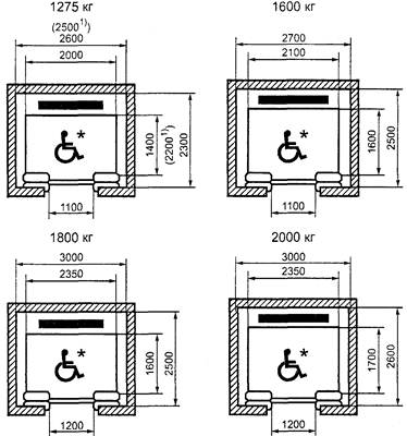 3 Кабины лифтов предназначены для транспортирования больного на кроватях, максимальные габариты которых (см. символы на чертеже):