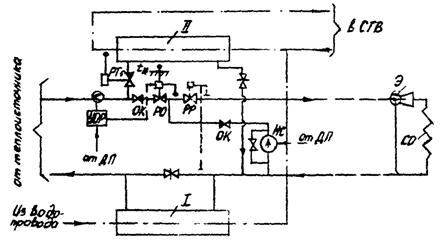 I, II - ступени водонагревателя горячего водоснабжения; ОК - обратный клапан; НС - насосы смешения; Э - элеватор с ручным регулированием (иглой); СО - система отопления; СГВ - система горячего водоснабжения; ДП - диспетчерский пункт. Остальные обозначения см. в тексте