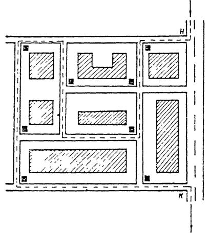 а - с одной стороны улицы (для улиц с двусторонним движением); б - с двух сторон улицы (внутриквартальные проезды); ----- - повторные проезды