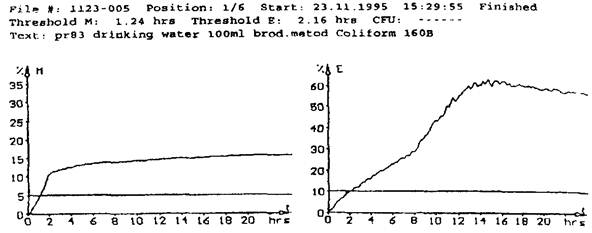 При наличии в исследуемом образце воды единичных клеток колиформных бактерий изменение сигнала импеданса превышает 5 %-ное пороговое значение по М-параметру за период времени менее 16 часов.