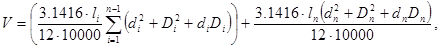 - вычисление объема бревна без коры V, м3, как суммы объемов секций по формуле