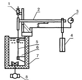 1 - стрелочный индикатор; 2 - рычаг для передачи силы; 3 - прибор для учета времени; 4 - контрольный груз; 5 - образец; 6 - испытуемая среда; 7 - теплоизолированная ванна; 8 - насос для циркуляции жидкости