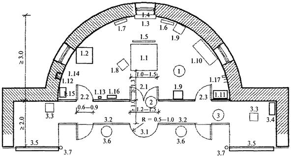Православные богослужения совершаются клириками и мирянами стоя, крестясь правой рукой (в некоторых случаях, держа в левой руке зажженную свечу), с поклонами, а иногда с коленопреклонениями, что следует учитывать при расчете необходимой площади храма требуемой вместимости (рис. 2). Сидеть разрешается только в редкие, определенные Уставом моменты службы, а также определенным категориям прихожан (больным, инвалидам). В притворе должны стоять оглашенные (готовящиеся к крещению) и кающиеся; в средней части храма - верные (крещеные христиане), в алтаре - священнослужители, на клиросе - певчие. Во время богослужения внимание молящихся обращено в основном в сторону алтарной преграды с иконами святых и в направлении движения священнослужителей. Ничто, ни элементы строительных конструкций - визуально, ни средства архитектурной декорации - эмоционально не должно мешать или отвлекать молящихся от совершающегося в храме богослужения.